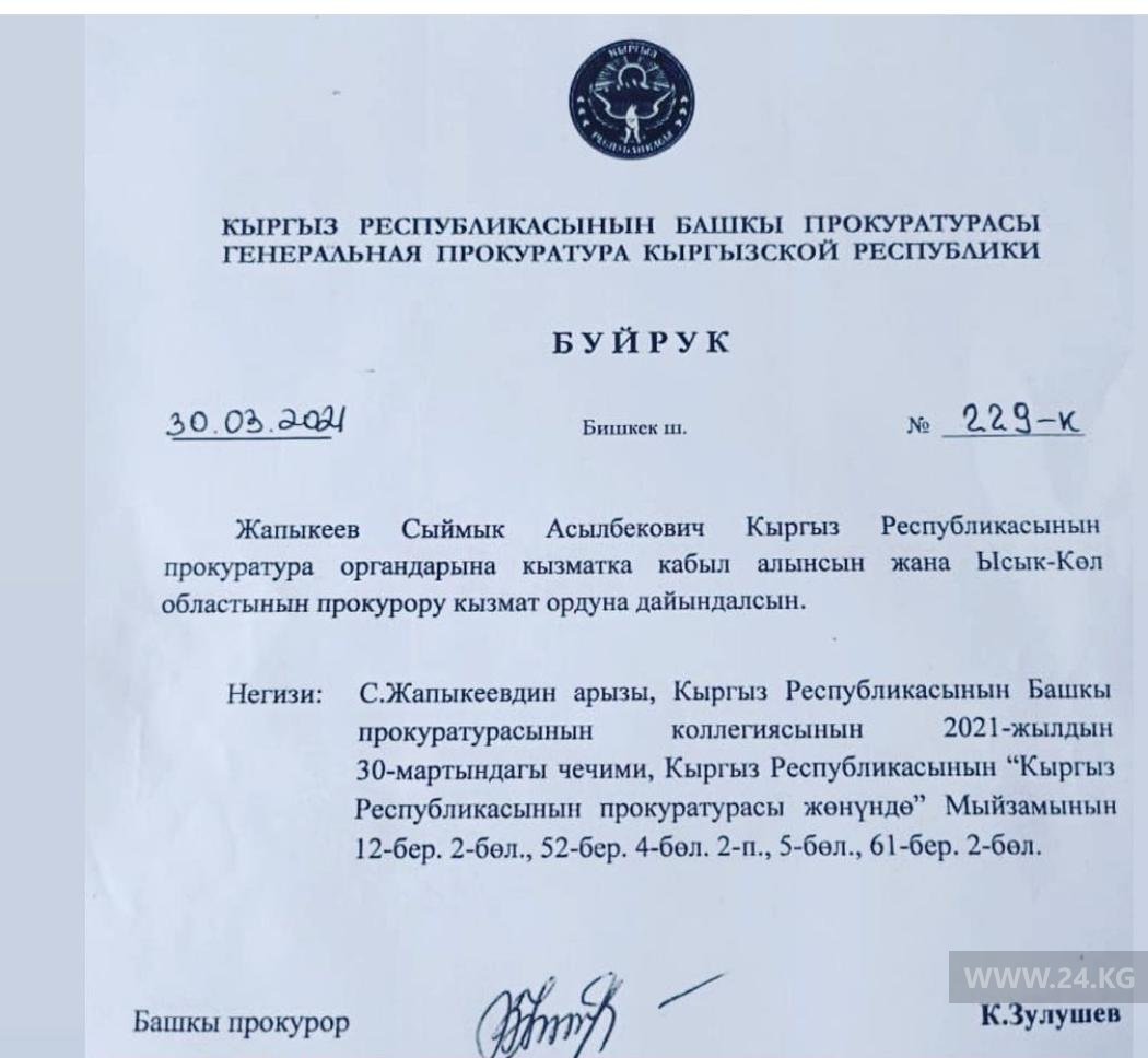 Согласно приказу, имеющемуся в распоряжении редакции, Сыймык Жапыкеев вновь принят на работу в органы прокуратуры и назначен главой надзорного органа Иссык-Кульской области.