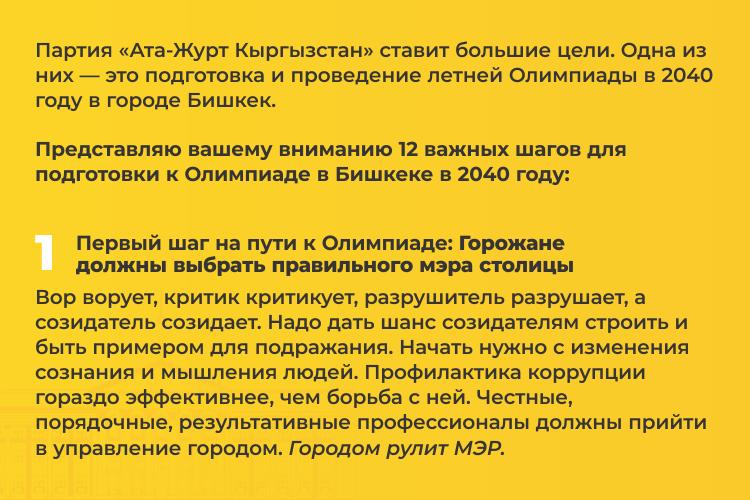 Оплачено из избирательного фонда политической партии «Ата-Журт Кыргызстан» УП по финансовым вопросам Болотакуновой С. А.