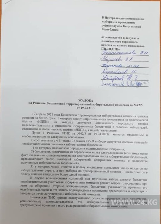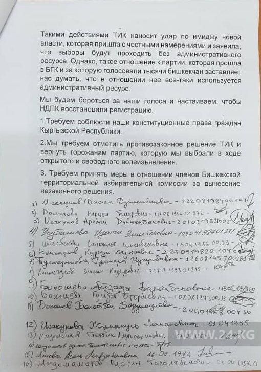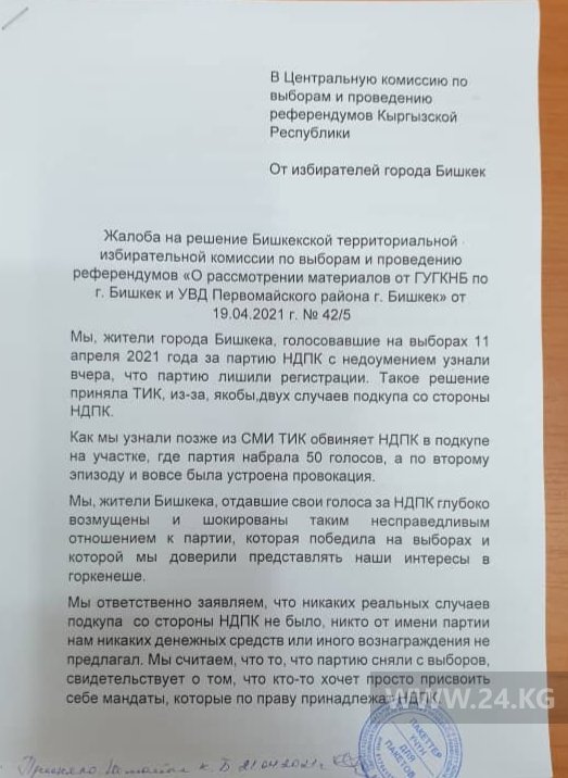 Избиратели и кандидаты от партии НДПК написали жалобу в ЦИК на решение Бишкекской ТИК об отмене регистрации списка политорганизации.