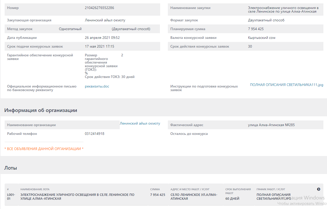 В тендере, который заканчивается 17 мая, указано, что айыл окмоту планирует закупить электроснабжение уличного освещения в селе Ленинском по улице Алма-Атинской.