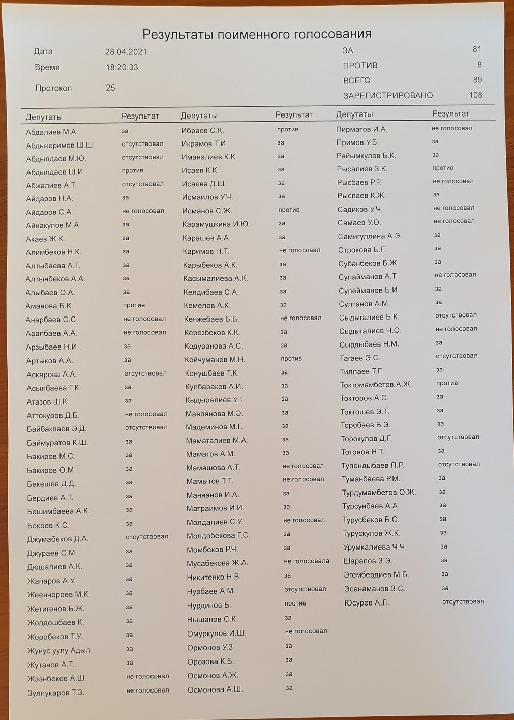 Спикер Талант Мамытов поставил на голосование решение комитета по социальным вопросам, образованию, науке, культуре и здравоохранению с рекомендацией уволить главу Минздрава.