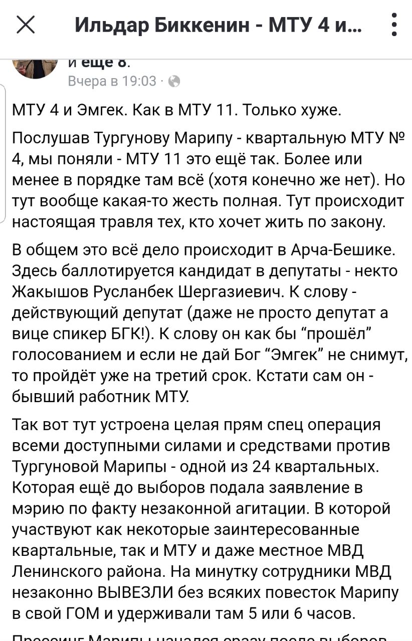 «Устроена целая спецоперация всеми доступными силами и средствами против Марипы Тургуновой — одной из 24 квартальных. Она еще до выборов подала заявление в мэрию по факту незаконной агитации, в которой участвуют как некоторые заинтересованные квартальные, так и МТУ и даже местное МВД Ленинского района. Прессинг Марипы начался сразу после выборов», — говорится в публикации.