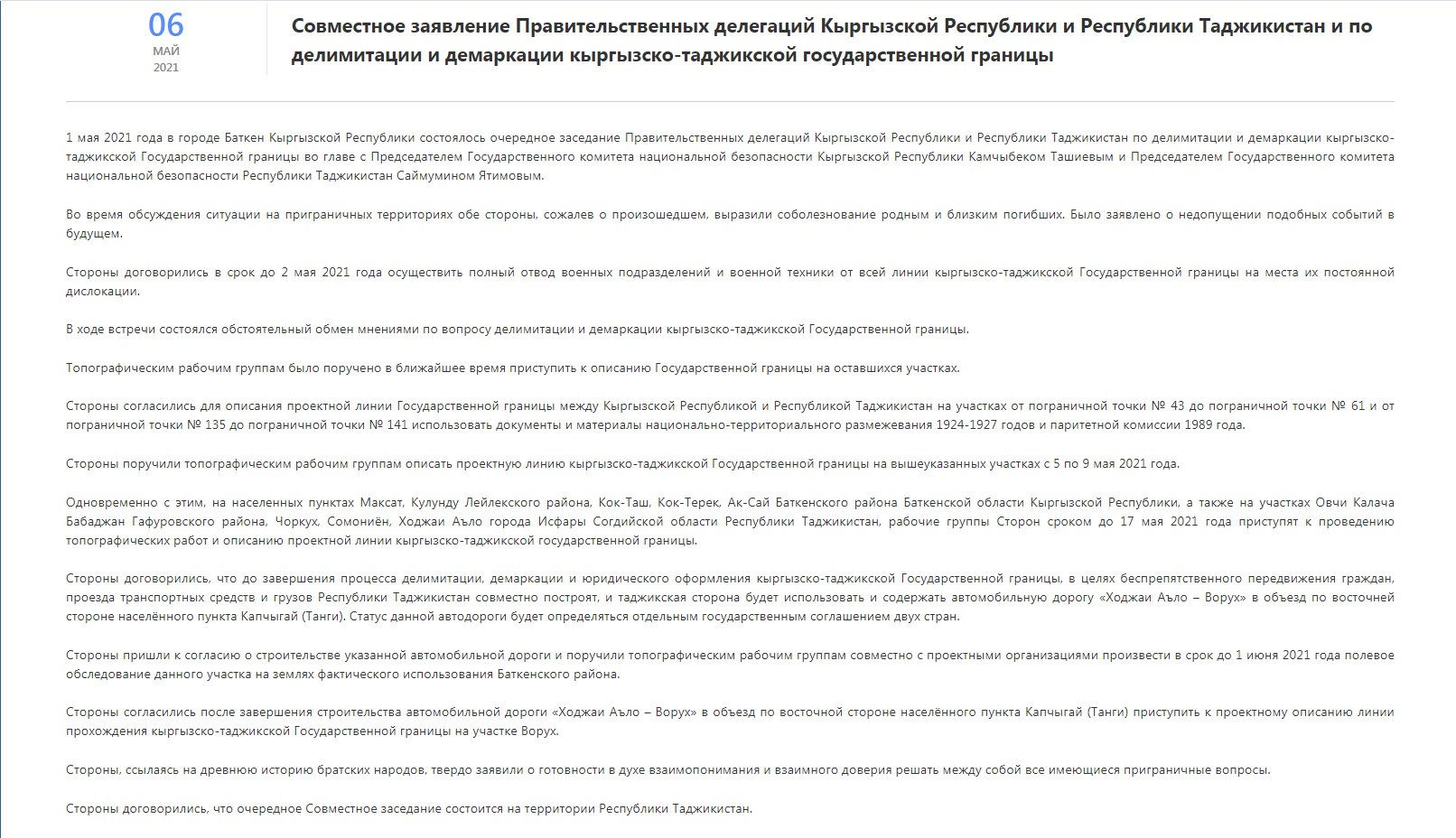 Уточняется, что 1 мая в Баткене состоялось очередное заседание правительственных делегаций КР и РТ по делимитации и демаркации кыргызско-таджикской границы.
