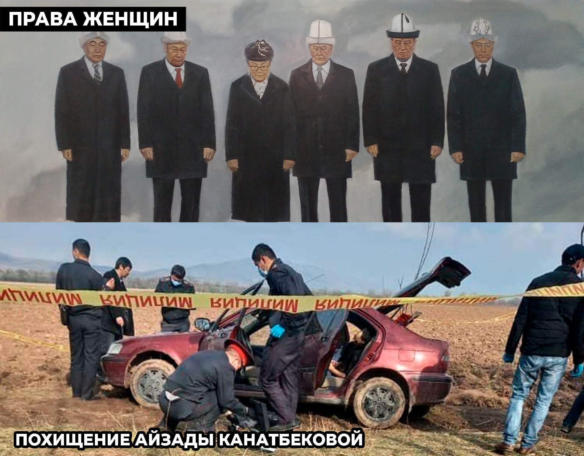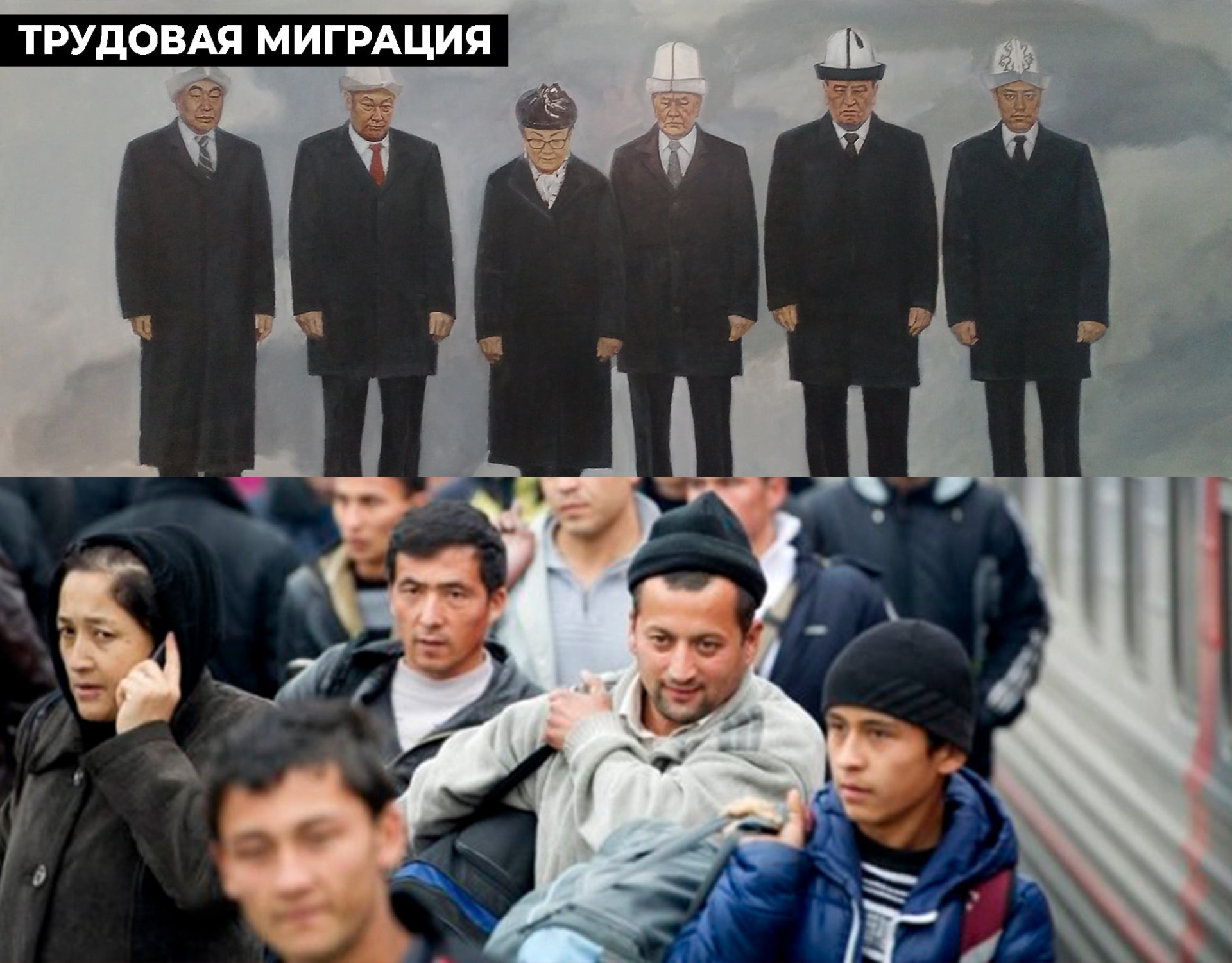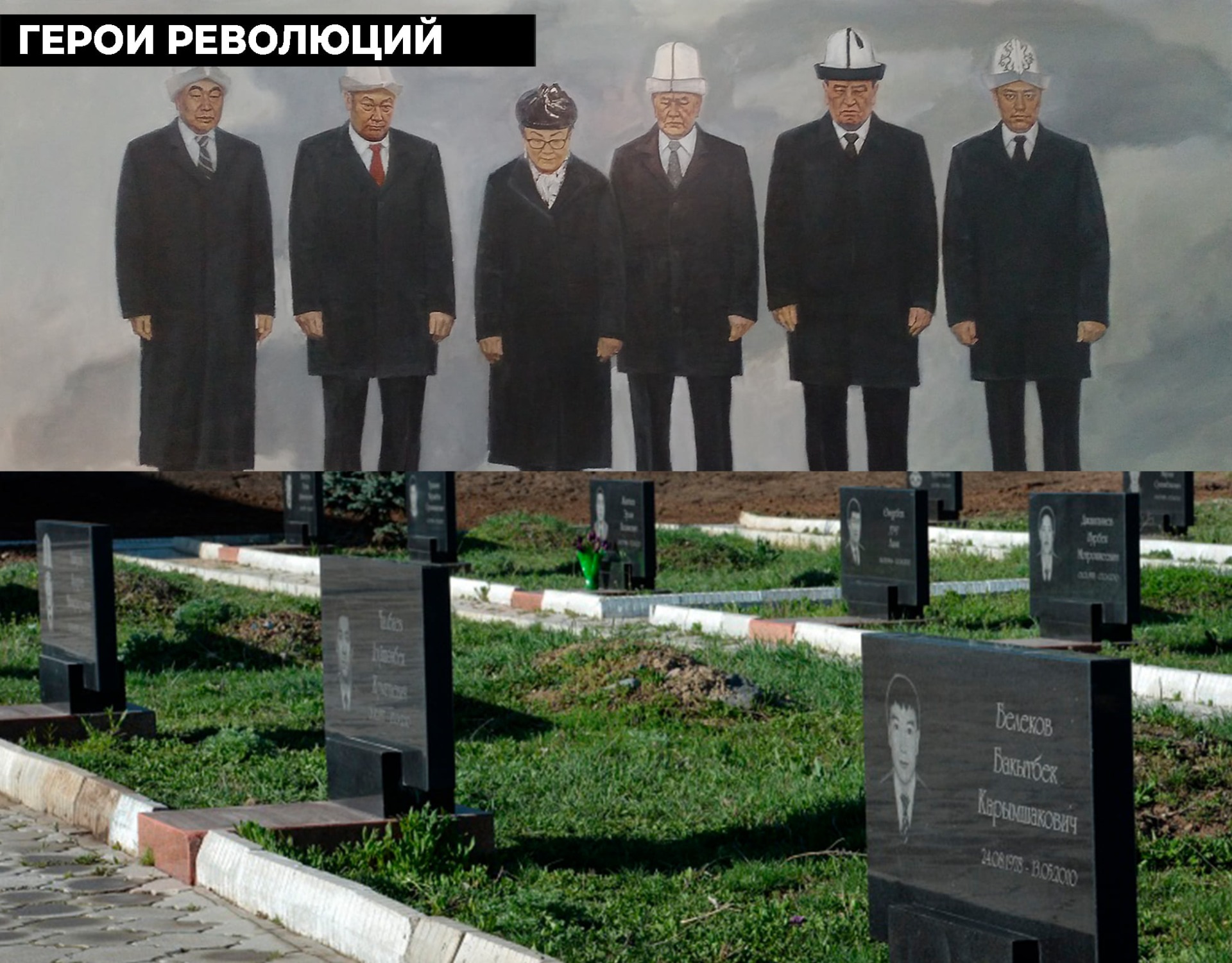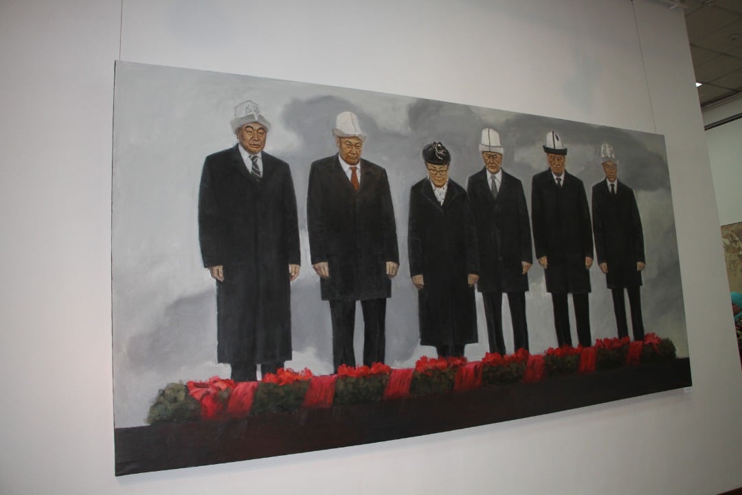На выставке представлены этюды и эскизы, посвященные истории страны — от баткенских событий до Олимпиады в Токио. Особенно популярной в соцсетях стала фотография картины «Ата-Бейит», на которой изображены все шесть президентов страны. Они в траурной одежде стоят перед поминальным венком. Позади них можно увидеть карту Кыргызстана в пепельно-сером цвете.