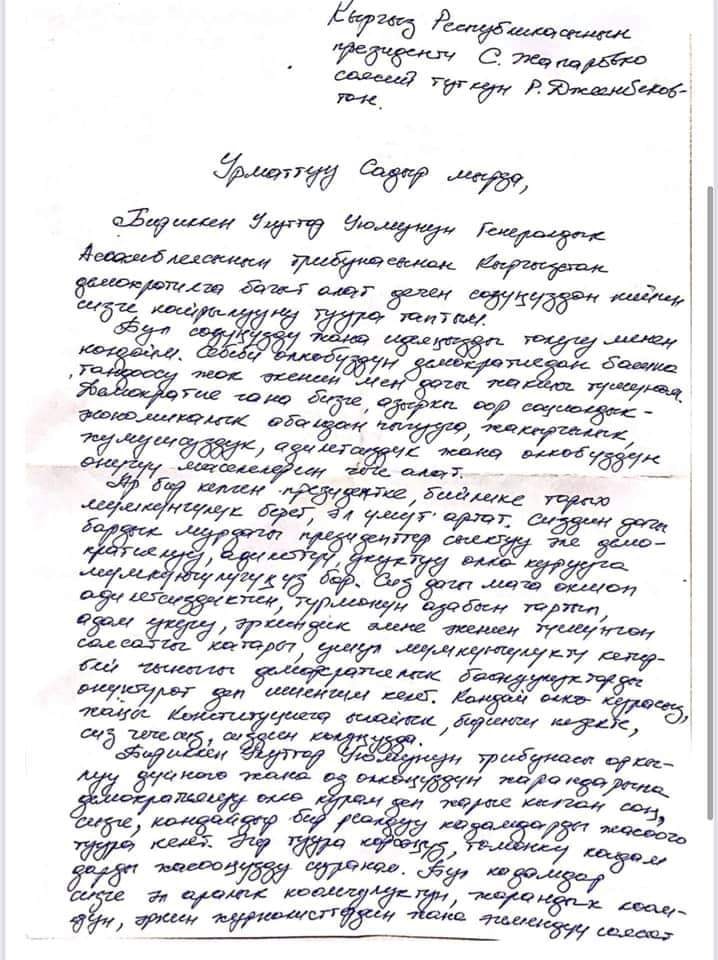 «Вы тоже, как и я, пережили несправедливость, тюремное заключение и знаете цену свободы. Поэтому я хочу верить, что вы воспользуетесь возможностью развивать реальные демократические ценности. Раз вы перед мировым сообществом заявили, что построите демократическое общество, вам придется сделать несколько реальных шагов», — написал Равшан Джеенбеков.