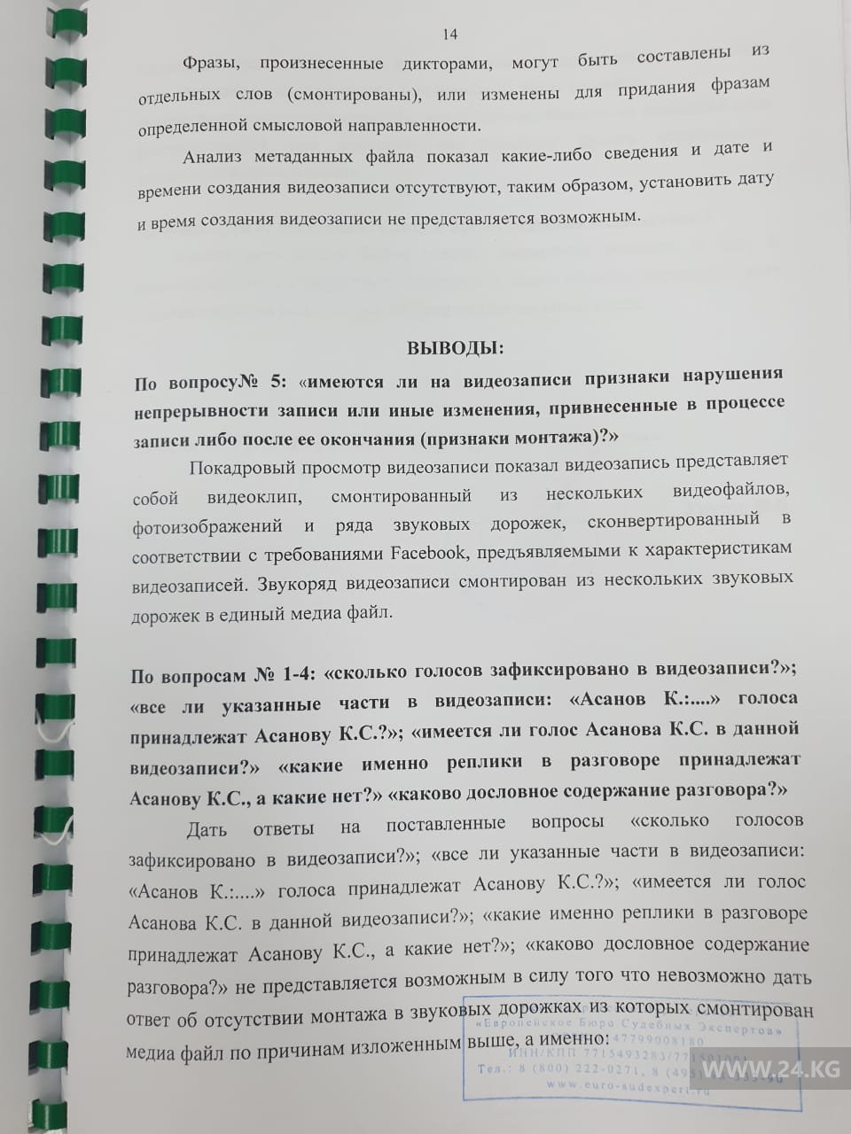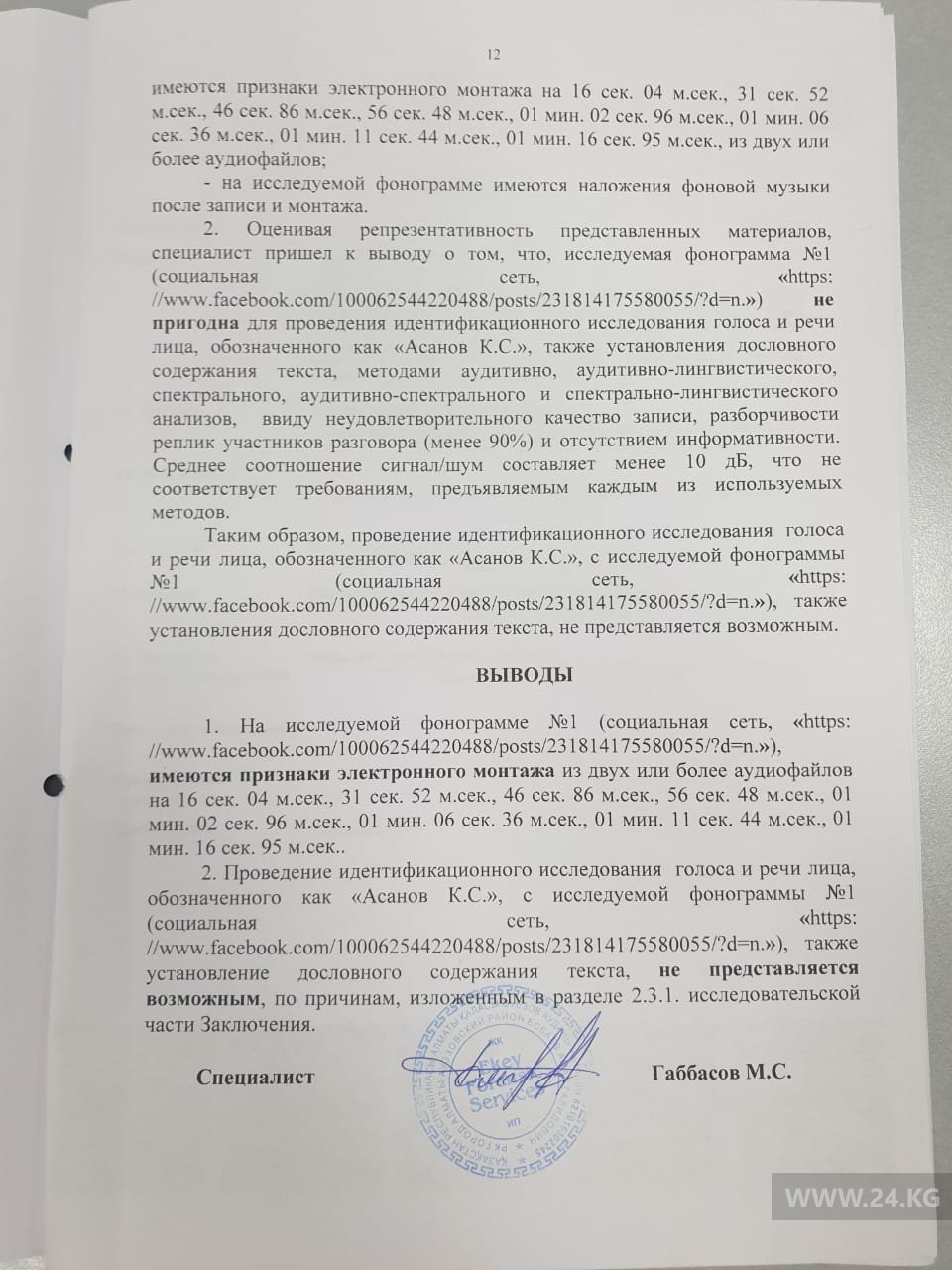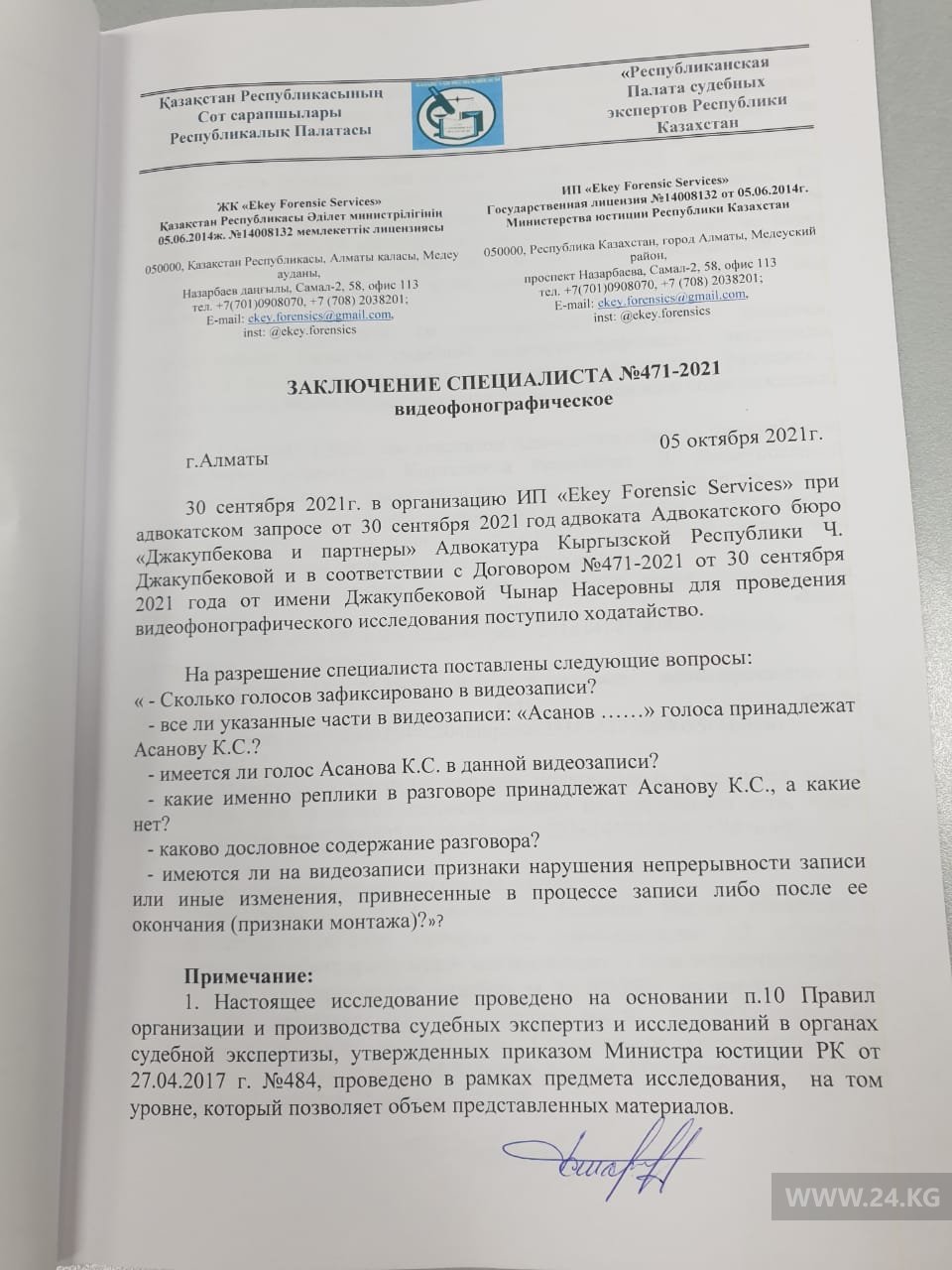 «Мы инициировали проведение двух независимых экспертиз. Специалисты пришли к мнению, что запись, где экс-замминистра внутренних дел Курсан Асанов якобы говорит о захвате власти, смонтирована. В документах по секундам расписано, в каких местах есть монтаж двух или более аудиофайлов», — сказала Чынара Джакупбекова.