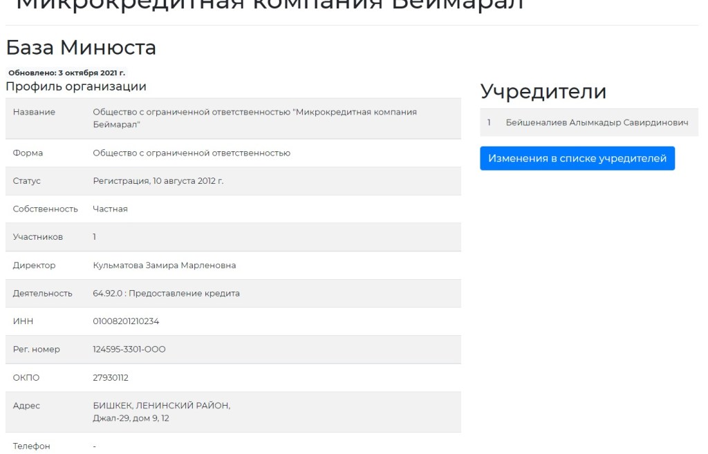 По тому же адресу находится микрокредитная компания Алымкадыра Бейшеналиева «Беймарал». Ее основали в 2012 году. Фирма оплатила налогов на 71 тысячу сомов до 2015-го. По данным НБ КР, она не имеет лицензии.