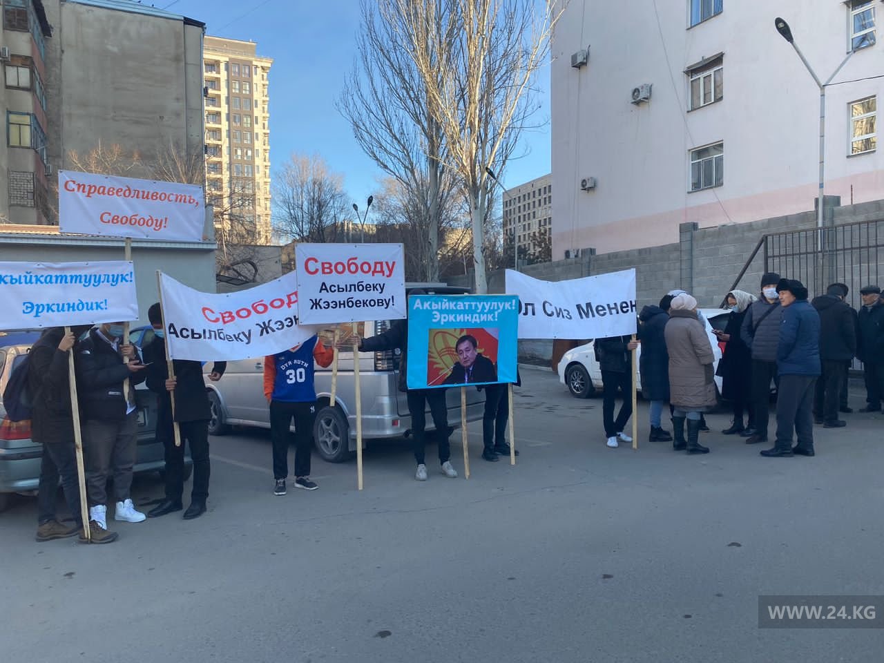 В Бишкеке около здания Первомайского районного суда проходит митинг в поддержку задержанного по делу «Кумтора» экс-спикера Асылбека Жээнбекова.