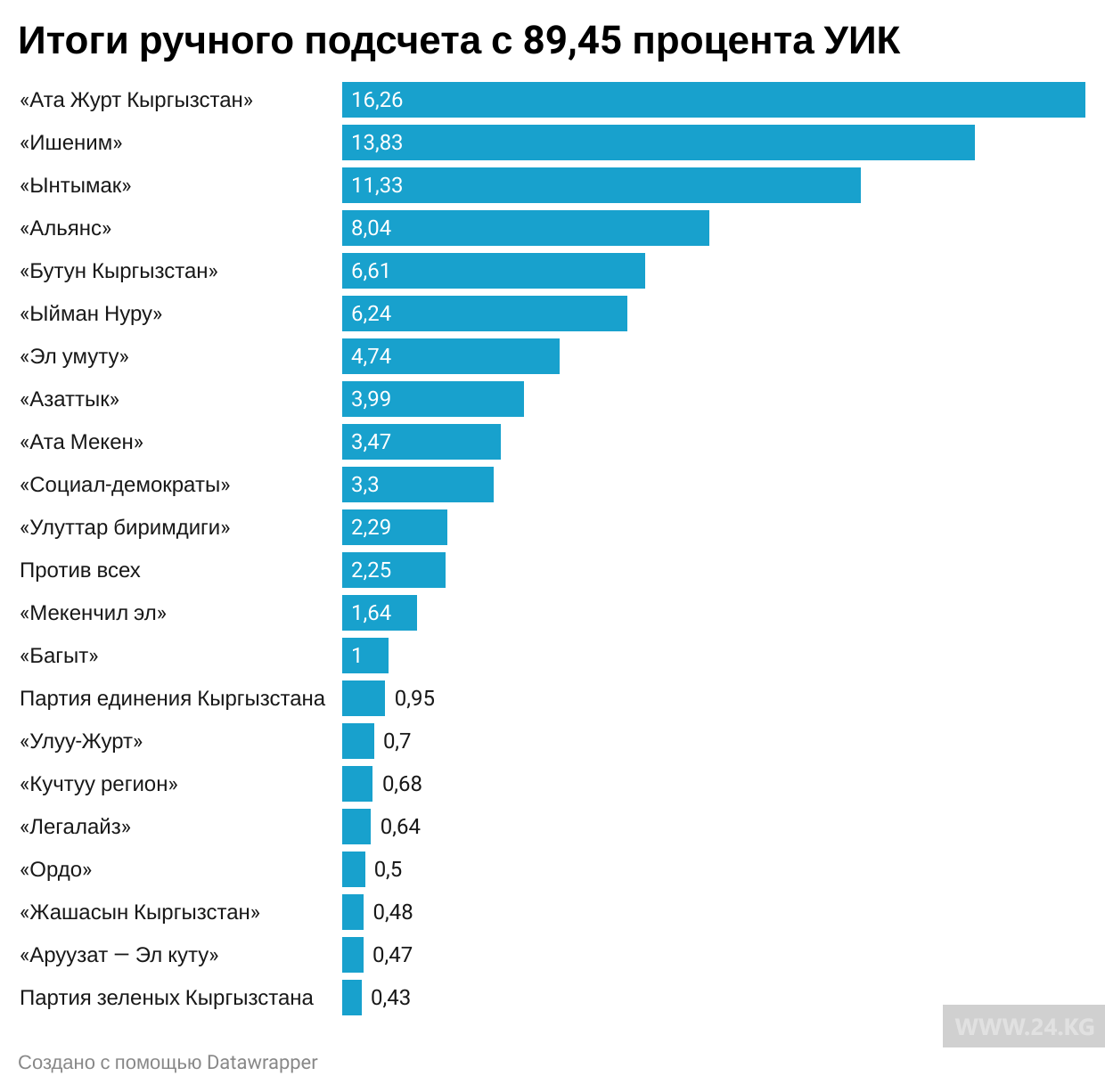 По единому избирательному округу на 8.30 протоколы поступили с 2 тысяч 231 (89,45 процента) участка из 2 тысяч 494. На данный момент пятипроцентный порог по единому округу преодолевают партии «Ата Журт Кыргызстан», «Ишеним», «Ынтымак», «Альянс», «Бутун Кыргызстан» и «Ыйман Нуру».