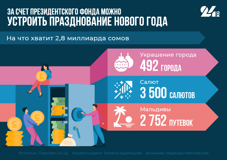 Можно устроить себе новогодние каникулы. Отдыхать в этом году кыргызстанцы будут до 10 января. Например, недельная путевка на Мальдивы стоит $12 тысяч. На 2,8 миллиарда сомов можно купить 2,7 тысячи таких туров.