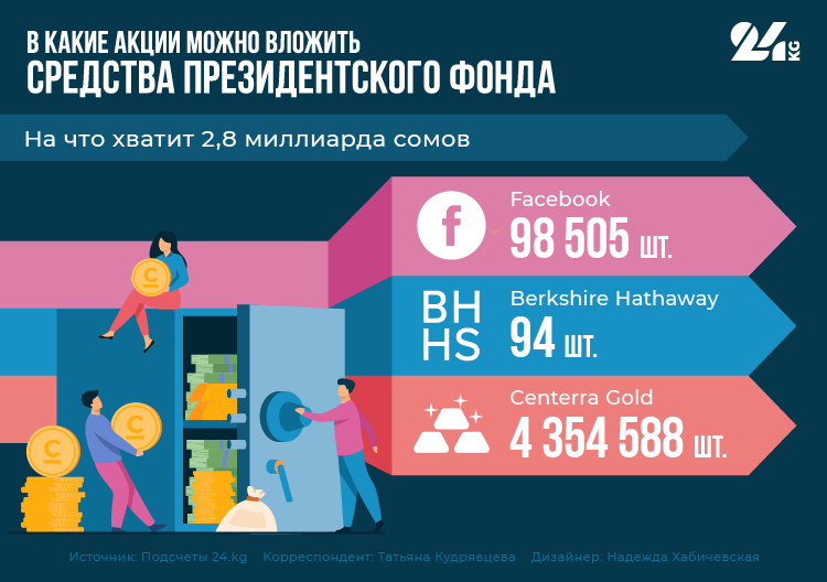 Можно стать и одним из владельцев золоторудной компании Centerra Gold. Сейчас одна ее акция стоит 9,73 канадских доллара. На 2,8 миллиарда сомов президентского фонда можно купить 4,3 миллиона таких акций. К слову Кыргызстану в компании принадлежит 77,4 миллиона акций.