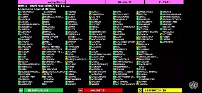 Как передает собственный корреспондент «Укринформа» в Нью-Йорке, решение было принято беспрецедентным количеством голосов: под аплодисменты за проголосовала 141 страна, против — 5 (Россия, Беларусь, Сирия, КНДР, Эритрея), воздержались — 35.