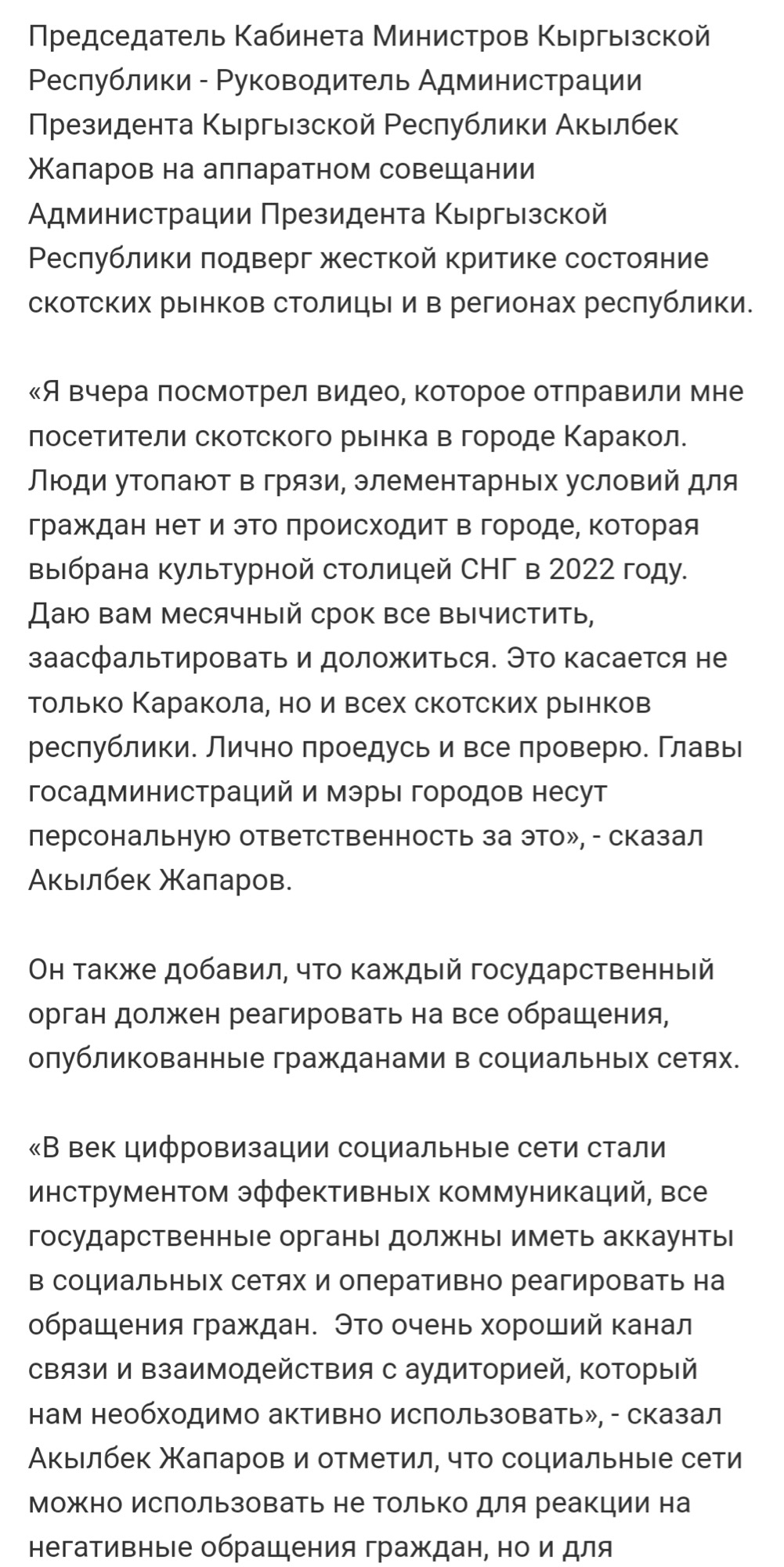 «Я вчера посмотрел видео, которое отправили мне посетители скотского рынка в городе Каракол. Люди утопают в грязи, элементарных условий для граждан нет и это происходит в городе, которая выбрана культурной столицей СНГ в 2022 году. Даю вам месячный срок все вычистить, заасфальтировать и доложиться. Это касается не только Каракола, но и всех скотских рынков республики. Лично проедусь и все проверю. Главы госадминистраций и мэры городов несут персональную ответственность за это», — сказал Акылбек Жапаров, очевидно имея в виду все-таки скотные рынки.