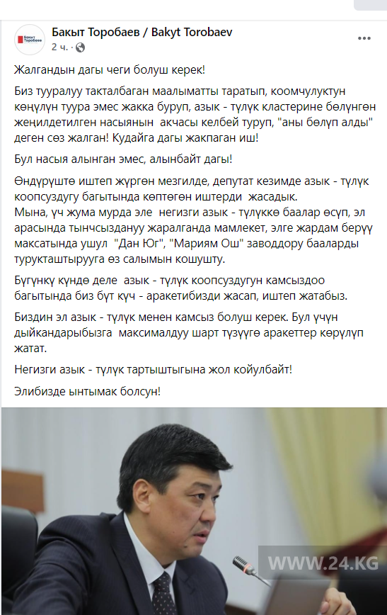 Заместитель председателя кабинета министров Бакыт Торобаев опроверг заявления депутата Эльвиры Сурабалдиевой о том, что 10 миллиардов сомов, предусмотренных для кредитования агропромышленного сектора, поделены между компаниями чиновников и нардепов. Об этом он написал на своей странице в Facebook.