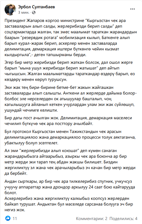 «Потому что именно там начинаются перестрелки из-за незначительных вопросов и перерастают в большие столкновения. Поэтому стороны пришли к такому решению. Ни один пост не открывали. Приграничные посты не будут открывать до тех пор, пока не решатся вопросы делимитации и демаркации границ. Этот протокол считается временным», — написал со слов главы государства Эрбол Султанбаев.