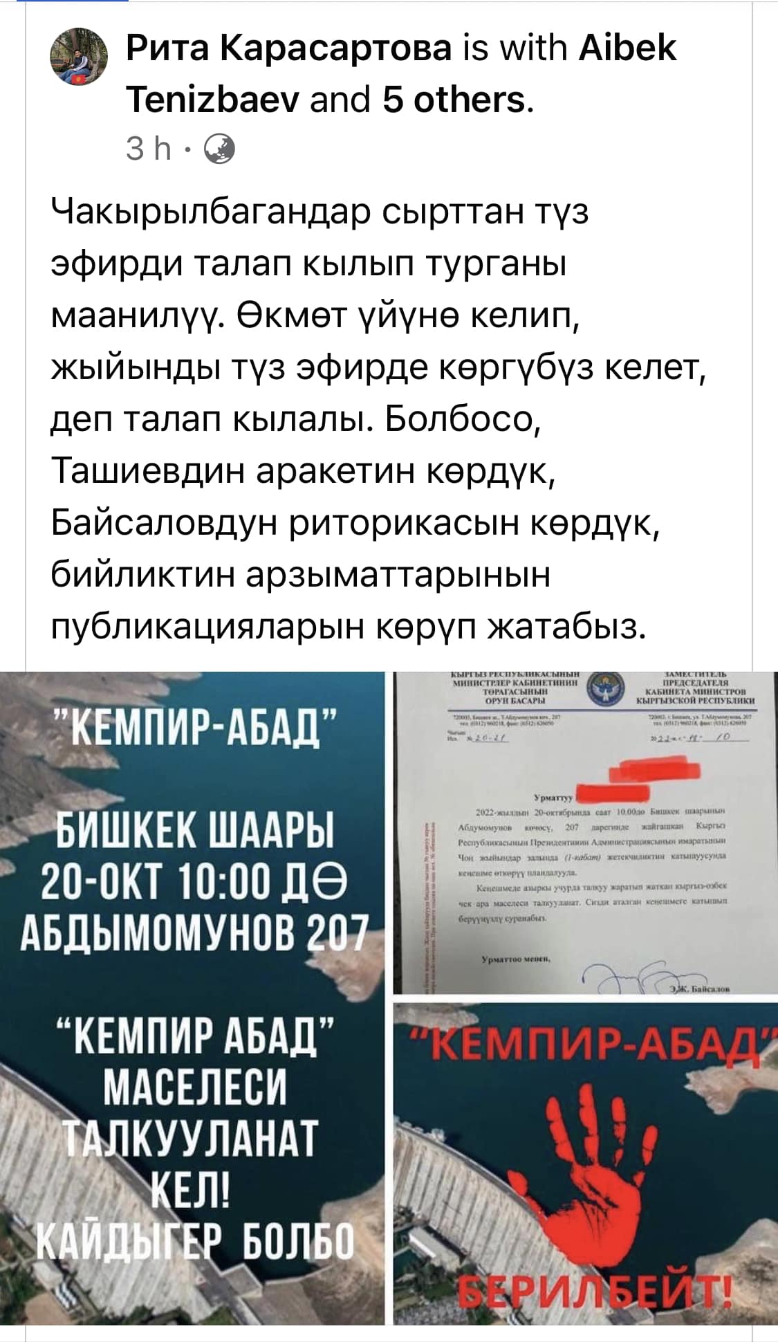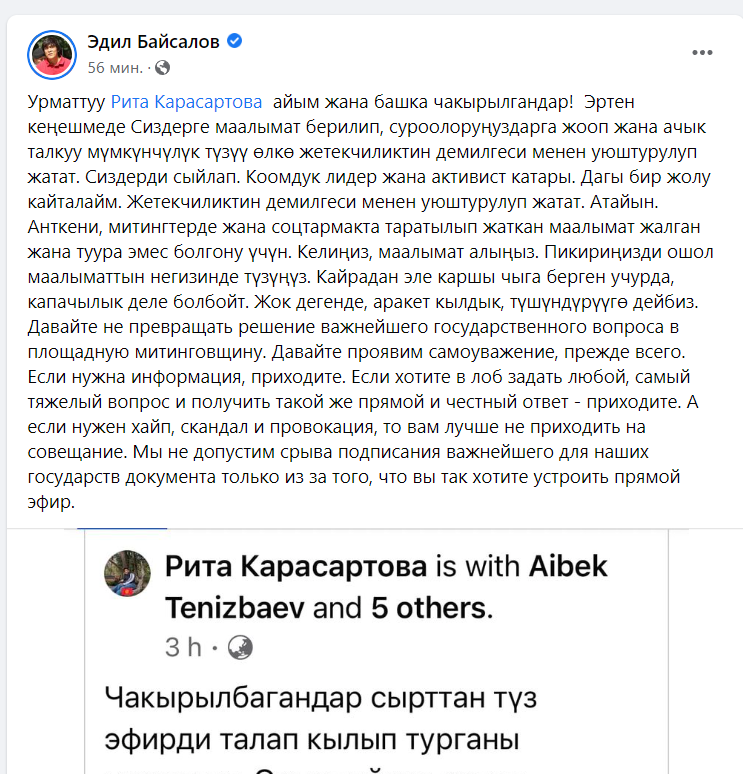 Однако правозащитница Рита Карасартова и гражданский активист Атай Бейшенбек потребовали проведения открытой встречи с прямой трансляцией в соцсетях.