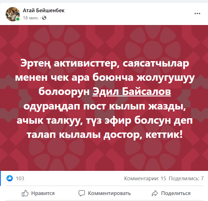 «Очень важно, чтобы те, кого не пригласили, требовали прямого эфира из Дома правительства. Мы видели действия Камчыбека Ташиева, риторику Эдиля Байсалова, видим и публикации сторонников власти», — отметила она.