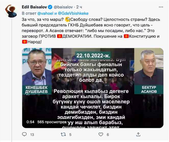«Здесь бывший председатель ГКНБ Дуйшебаев (Кенешбек Дуйшебаев, он накануне задержан и водворен в ИВС. — Прим. 24-kg.com) ясно говорит, что цель — переворот. А Асанов (Бектур Асанов также водворен в изолятор. — Прим. 24-kg.com) отвечает: «Либо мы посадим, либо нас». Это заговор против демократии. Покушение на Конституцию и народ», — написал замглавы кабмина.