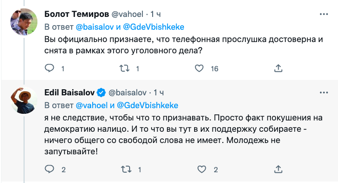 Эдиль Байсалов также написал: «Просто факт покушения на демократию налицо. И то, что вы тут в их поддержку собираете, ничего общего со свободой слова не имеет».