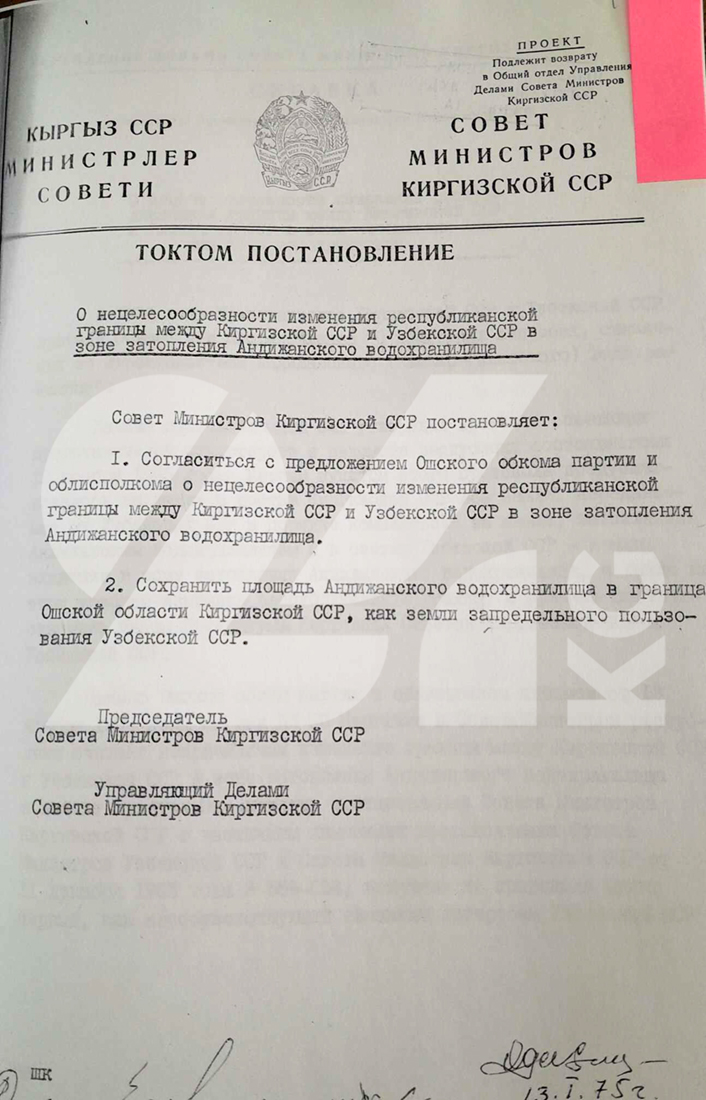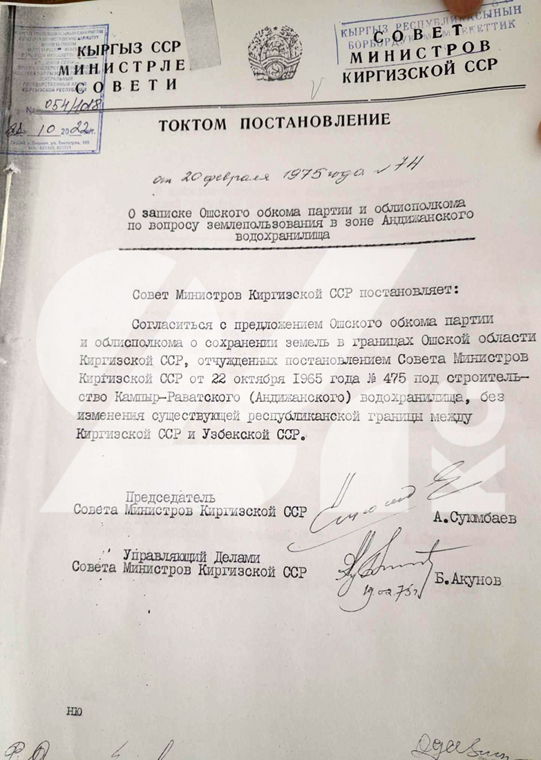 Последний документ датируется 20 февраля 1975-го. Он подписан Ахматбеком Суюмбаевым. То есть фактически подтверждает принадлежность территории водохранилища Кыргызстану.