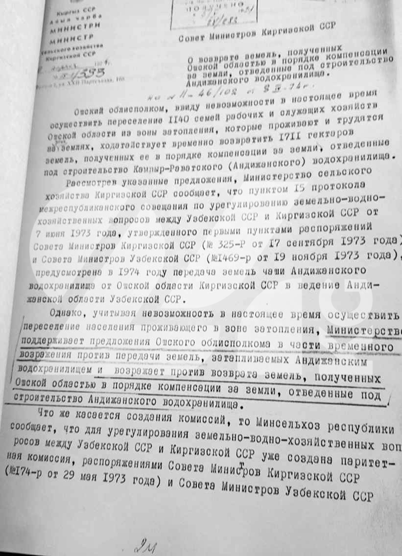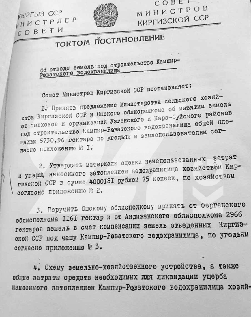 Вторым пунктом данного документа отмечается сохранение площади водохранилища в границах Ошской области как земли запредельного пользования Узбекской ССР.
