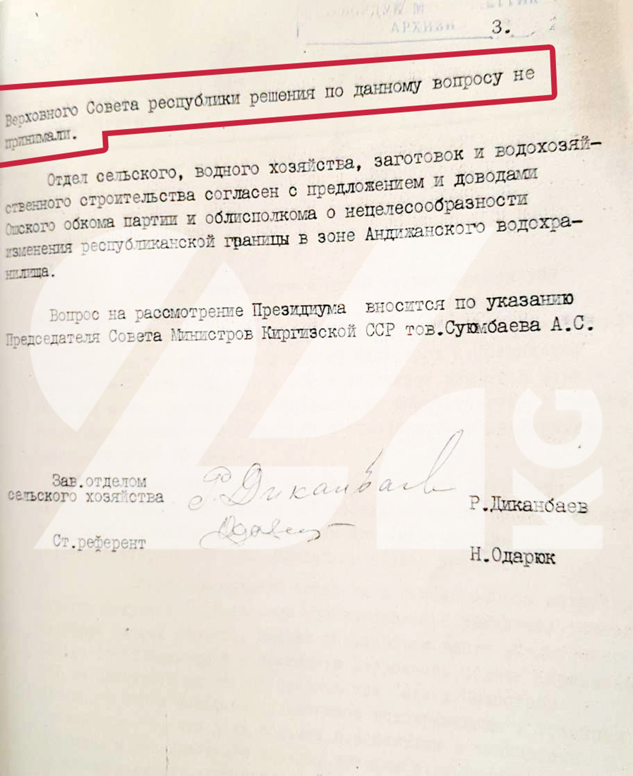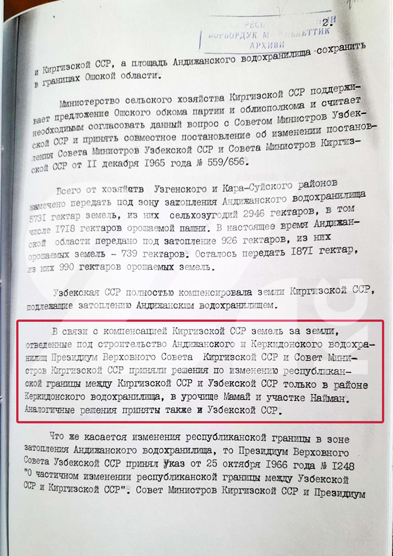 «Что касается изменения республиканской границы в зоне затопления Андижанского (Кемпир-Абадского. — Прим. 24.kg) водохранилища, то президиум Верховного совета Узбекской ССР принял Указ от 25 октября 1966-го № 1248 «О частичном изменении республиканской границы между Узбекской ССР и Киргизской ССР», — говорится в одном из документов.