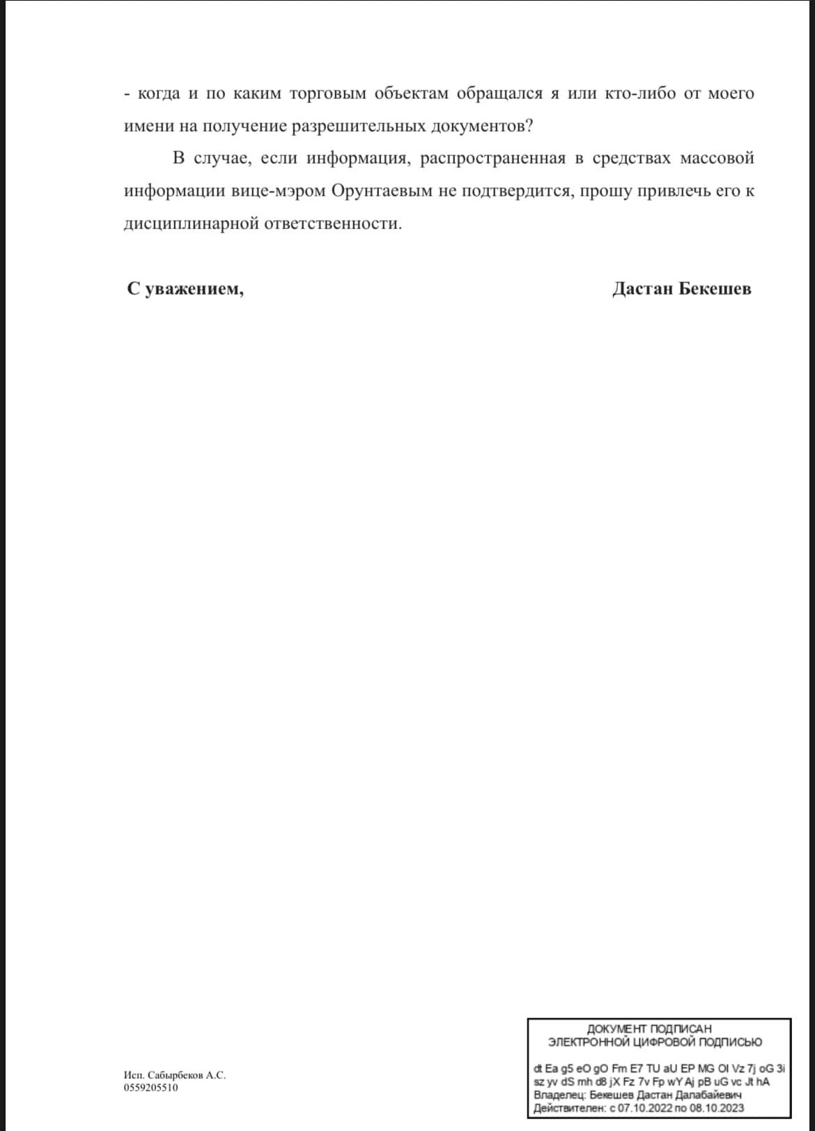 «В случае, если информация Орунтаева не подтвердится, прошу мэра привлечь его к дисциплинарной ответственности», — подытожил Дастан Бекешев.