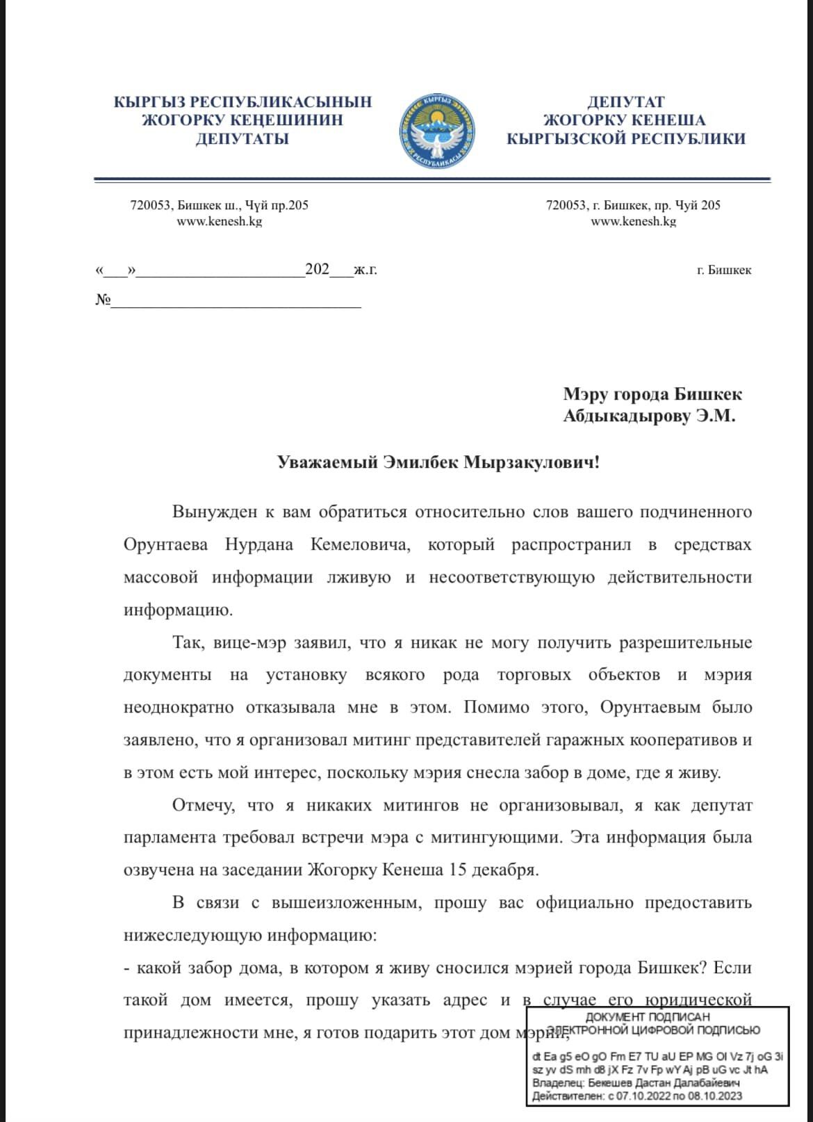 Депутат Жогорку Кенеша Дастан Бекешев обратился к мэру Бишкека Эмилбеку Абдыкадырову по поводу заявлений его заместителя Нурдана Орунтаева в СМИ. Об этом парламентарий сообщил на своей странице в Facebook.