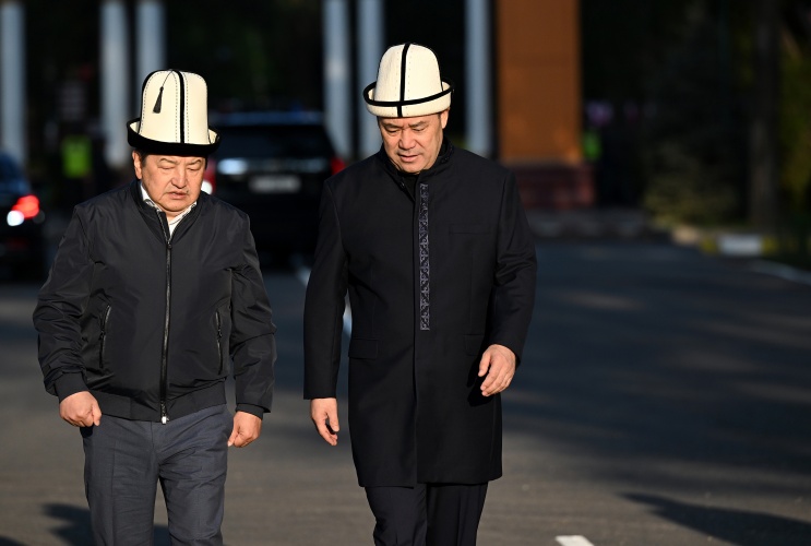 Садыр Жапаров пришел на Старую площадь в сопровождении главы кабинета министров Акылбека Жапарова. Он был в сюртуке, который сшит в национальном стиле.