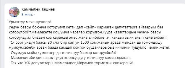 «Да, действительно, в Казахстане поднялись цены на муку, но это не зависит от нас и нашему народу никакого вреда не нанесет. Один килограмм муки первого сорта стоит 30 сомов, мешок — 1,5 тысячи. В ближайшее время, возможно, подешевеет, потому что мы запаслись зерном по низкой стоимости. Нам хватит этого до следующего урожая. Запасов растительного масла, сахара тоже достаточно, цены расти не будут. Продовольствия в нашей стране достаточно. Так что, депутаты ЖК Маматалиев, Икрамов, тормозни — сникерсни!» — написал Камчыбек Ташиев.