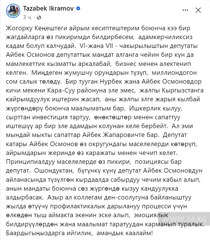 Депутат Жогорку Кенеша Тазабек Икрамов выступил в поддержку своего коллеги Айбека Осмонова. Свое обращение он опубликовал на своей странице в Facebook.