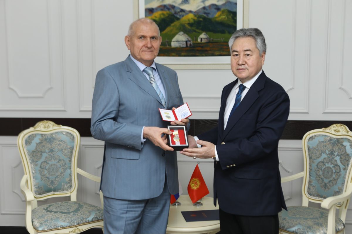 В завершение встречи Жээнбек Кулубаев наградил Николая Удовиченко юбилейной медалью МИД Кыргызстана за значимый вклад в развитие кыргызско-российских отношений.
