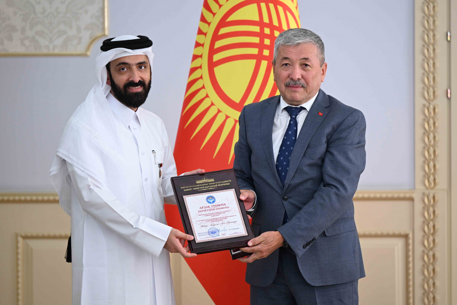В завершение встречи за активную благотворительную деятельность в Кыргызской Республике Адылбек Касымалиев наградил почетной грамотой кабмина Навафа Абдуллу Аль-Хаммади.