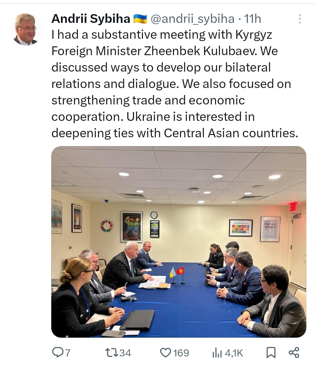 Андрей Сибига отметил, что стороны обсудили развитие двусторонних отношений и диалога. «Мы сосредоточились на укреплении торгово-экономического сотрудничества. Украина заинтересована в углублении партнерства со странами Центральной Азии», — подчеркнул он.