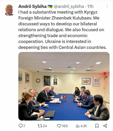 Министры иностранных дел Кыргызстана Жээнбек Кулубаев и Украины Андрей Сибига встретились на полях Генеральной Ассамблеи ООН. Об этом сообщил последний в социальной сети X (ранее Twitter).