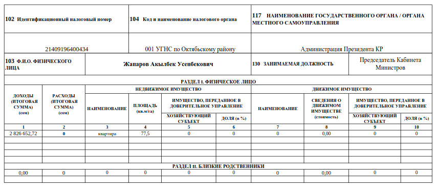 Напомним, в декларации за 2021 год тогда еще глава кабмина указал, что заработал 1 миллион 471 сом. В собственности у него была все таже квартира.