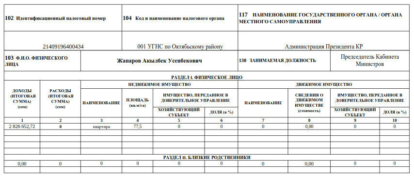 Согласно отчету, за указанный период он заработал 2 миллиона 826 тысяч 652,72 сома. Акылбек Жапаров по-прежнему владеет только квартирой площадью 77,5 квадратных метра.