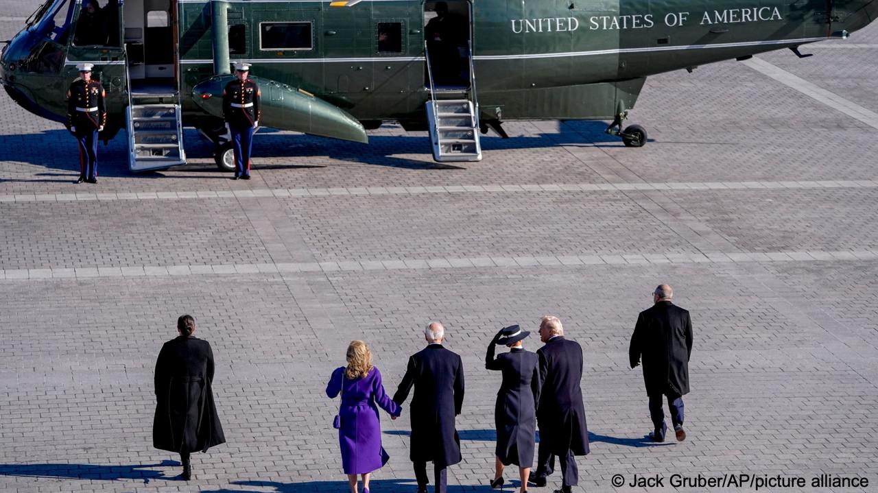 По окончании церемонии Трамп и его супруга Мелания по сложившейся традиции проводили уходящего Джо Байдена и Джилл Байден до вертолета армии США, который должен был увезти экс-президента с Капитолийского холма.