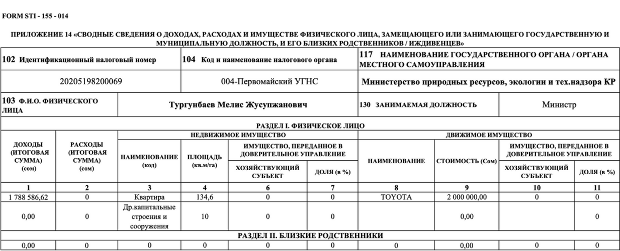 Налоговая служба начала публикацию деклараций о доходах чиновников по итогам 2023 года. Бывший министр природных ресурсов, экологии и технического надзора Мелис Тургунбаев предоставил сведения.