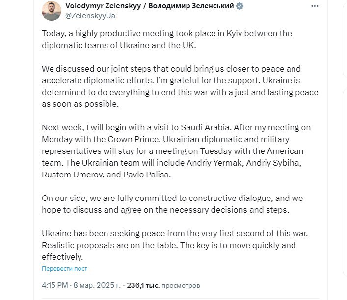 По словам Владимира Зеленского, он не будет принимать участие в переговорах с США, но 10 марта встретится с наследным принцем Саудовской Аравии Мухаммедом ибн Салман Аль Саудом. Украинские дипломаты и военные представители останутся в стране для переговоров с американской командой, добавил он.