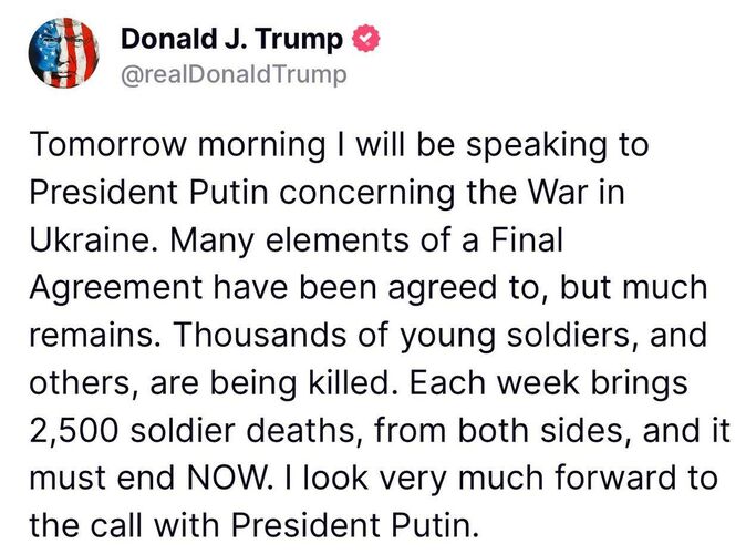 «Завтра утром я буду говорить с президентом Путиным о войне в Украине. Многие элементы окончательного соглашения согласованы, но многое еще предстоит сделать. Тысячи молодых солдат и другие люди гибнут. Каждую неделю погибают 2 тысячи 500 солдат с обеих сторон, и это должно прекратиться немедленно. Я с нетерпением жду разговора с президентом Путиным», — написал он.