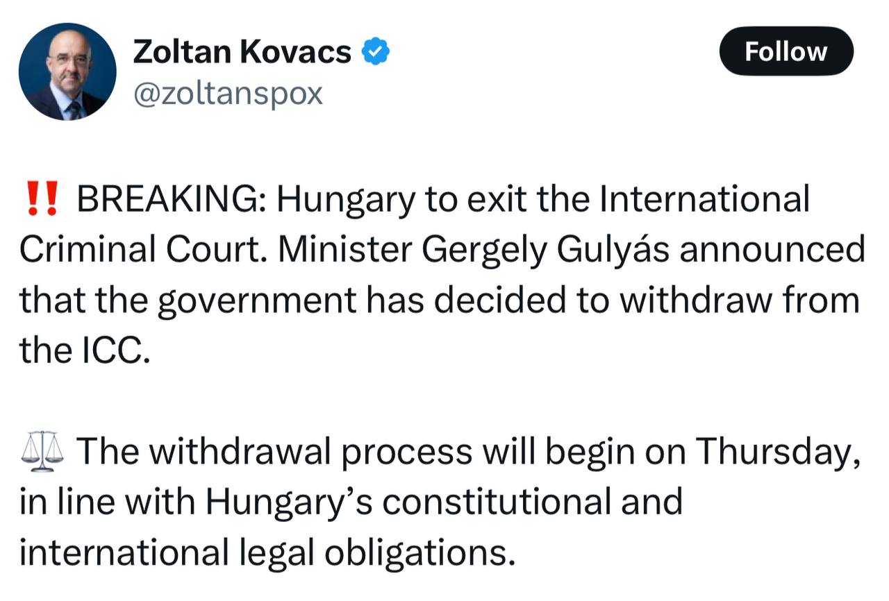 Венгрия выходит из Международного уголовного суда. Об этом сообщил представитель правительства Золтан Ковач на своей странице в X.