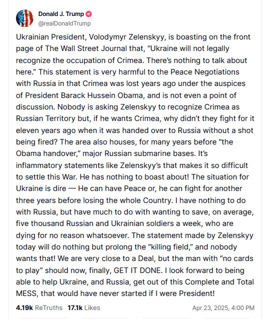 По словам Дональда Трампа, «именно подстрекательские заявления, подобные словам Зеленского», так затрудняют урегулирование конфликта.