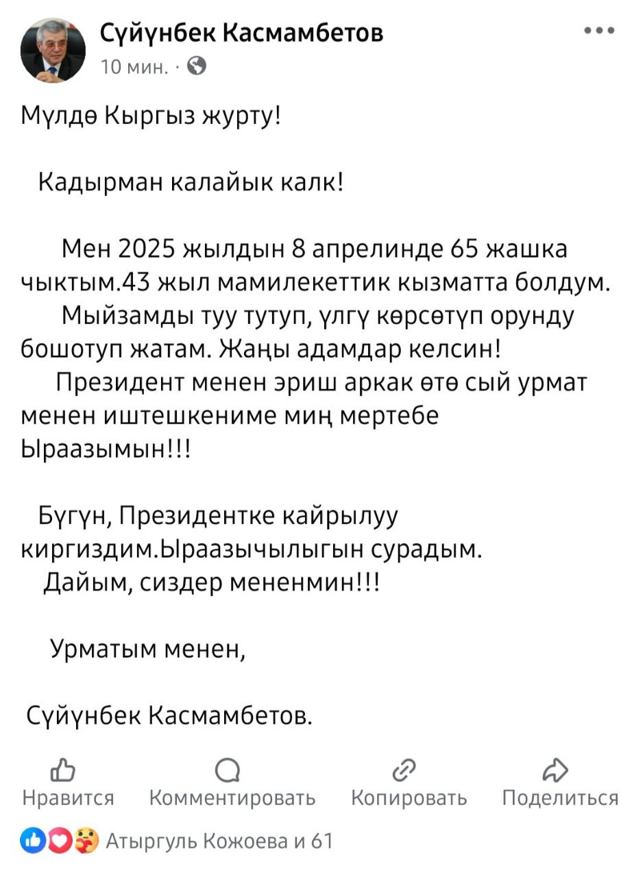 «43 года я проработал на государственной службе. Считая закон превыше всего и подавая пример, я освобождаю место. Пусть придут новые люди! Я тысячу раз благодарен за то, что работал с президентом в тесном сотрудничестве и с большим уважением! Сегодня я подал обращение главе государства. Я попросил его выразить благодарность», — написал Суйунбек Касмамбетов.