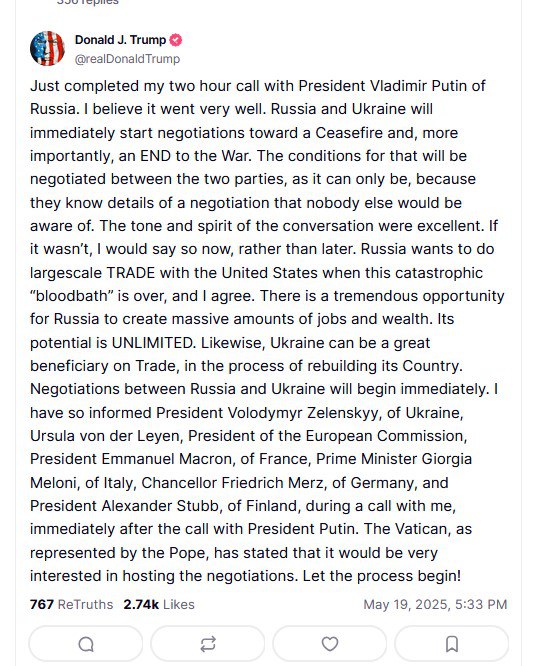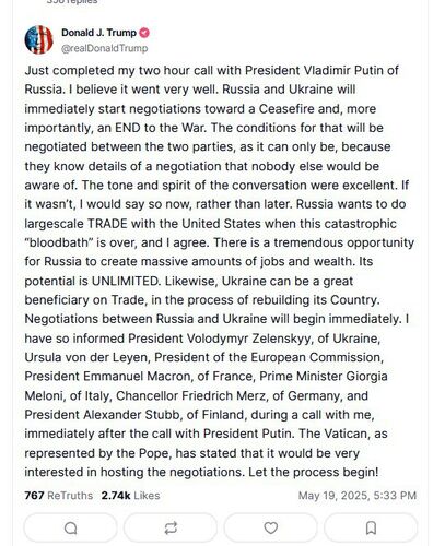 Он добавил: «Если бы это было не так, я бы сказал об этом сейчас, а не позже. Россия хочет вести крупномасштабную торговлю с США, когда эта катастрофическая «кровавая баня» закончится, и я согласен. У России есть колоссальная возможность создать огромное количество рабочих мест и богатств. Ее потенциал неограничен. Аналогично, Украина может стать большим бенефициаром в сфере торговли, в процессе восстановления своей страны. Переговоры между Россией и Украиной начнутся немедленно. Я проинформировал об этом президента Украины Владимира Зеленского, президента Европейской комиссии Урсулу фон дер Ляйен, президента Франции Эммануэля Макрона, премьер-министра Италии Джорджию Мелони, канцлера Германии Фридриха Мерца и президента Финляндии Александра Стубба во время телефонного разговора со мной, сразу после телефонного разговора с президентом Путиным. Ватикан, представленный папой, заявил, что он был бы очень заинтересован в проведении переговоров. Пусть процесс начнется!»