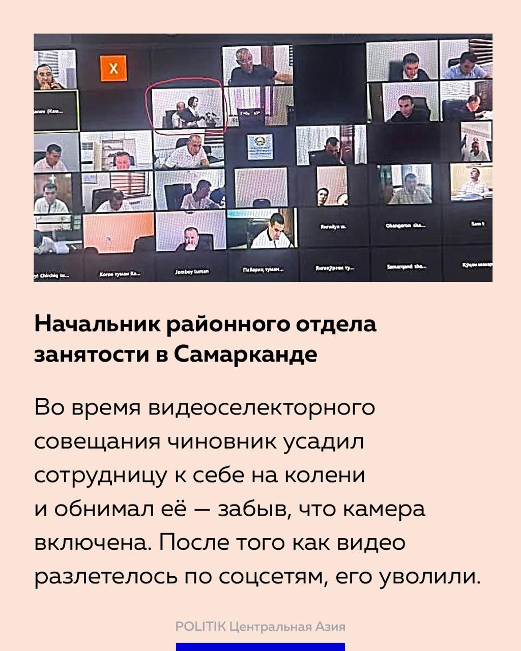 В Самарканде произошел большой скандал после того, как достоянием широкой общественности стала запись с рабочего совещания местных чиновников, проходившего в видеоформате. На одном из кадров руководитель районного отдела Министерства занятости и сокращения бедности Узбекистана усадил к себе на колени свою секретаршу и обнимал ее, забыв, что камера включена.