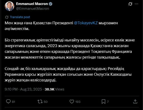 После этой беседы Эммануэль Макрон опубликовал пост на своей странице в X на казахском языке.