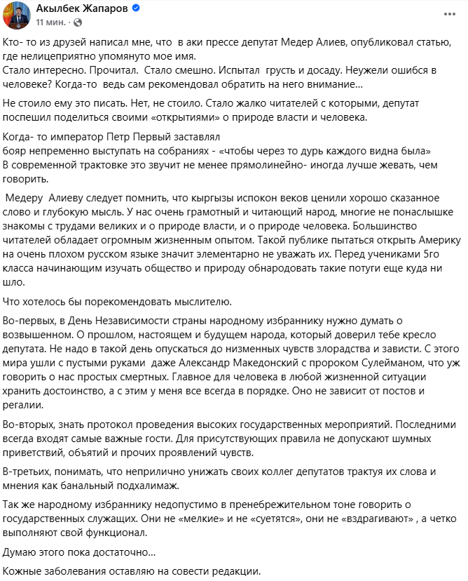 На критику Медера Алиева ответил сам Акылбек Жапаров. Он заявил, что статья написана на плохом русском языке и выглядит как неуважение к читателям: «Кто-то из друзей написал мне, что в СМИ депутат опубликовал материал, где нелицеприятно упомянуто мое имя. Прочитал — стало смешно, испытал грусть и досаду. Неужели ошибся в человеке?»Экс-глава кабмина добавил, что «иногда лучше жевать, чем говорить», напоминая, что уважение к слову и людям — одна из главных ценностей кыргызского общества.