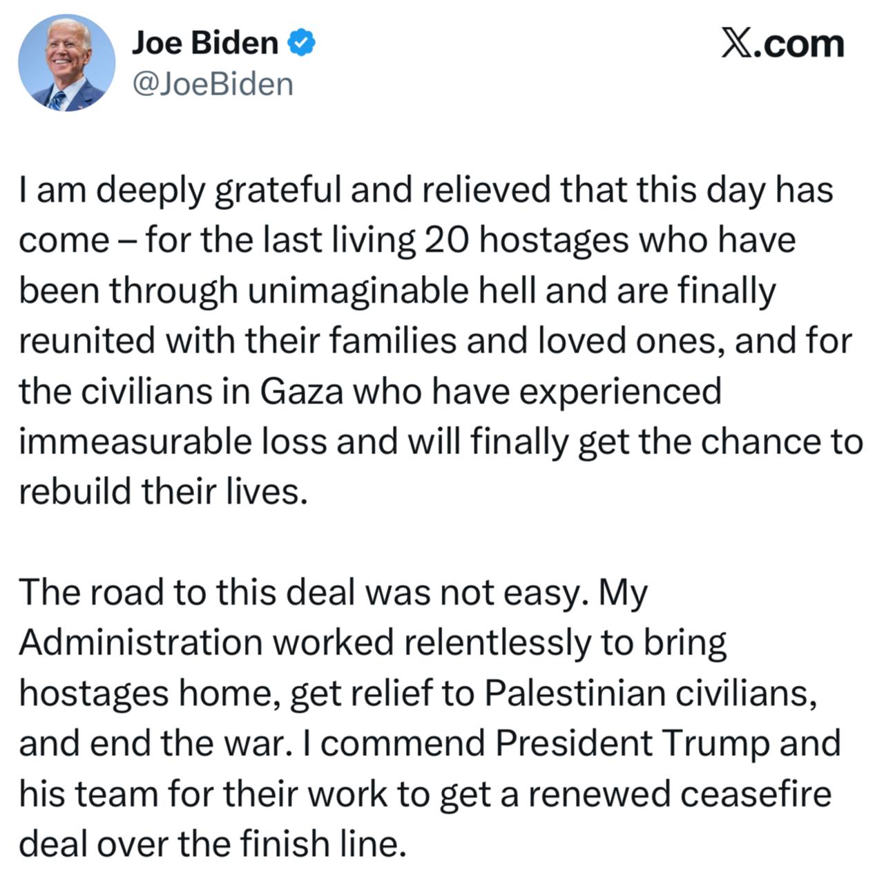 «Я глубоко благодарен и испытываю облегчение за то, что этот день настал — за последних оставшихся в живых 20 заложников, которые прошли через невообразимый ад и наконец-то воссоединились со своими семьями и любимыми, а также за гражданских лиц в Газе, которые пережили неизмеримые потери и, наконец, получат шанс восстановить свою жизнь», — отметил Джо Байден.