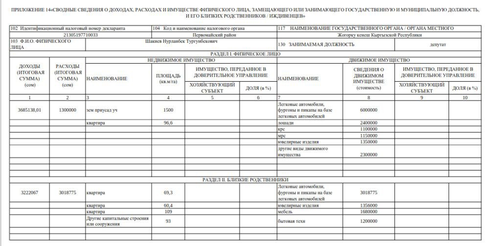В собственности спикера земельный приусадебный участок площадью 1,5 тысячи квадратных метров и квартира площадью 96,6 квадратного метра. Также легковые автомобили, фургоны и пикапы общей стоимостью 6 миллионов сомов.
